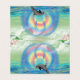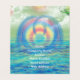 2 dolphins swimming in the ocean near a beautiful rising of colours and water with 2 planets, a moon and a colourful sun. Pink, blue, aqua, yellow and green colours in the water and sky.