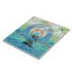 2 dolphins swimming in the ocean near a beautiful rising of colours and water with 2 planets, a moon and a colourful sun. Pink, blue, aqua, yellow and green colours in the water and sky.