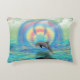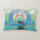 2 dolphins swimming in the ocean near a beautiful rising of colours and water with 2 planets, a moon and a colourful sun. Pink, blue, aqua, yellow and green colours in the water and sky.