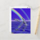 A postcard with my artwork of two dolphins playing in the water with a rainbow.