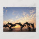 Beautiful photograph of a statue of dolphins leaping from the surface of a fountain in front of a beautiful image of the setting sun with fiery red clouds. A perfect travel image to brighten up any event