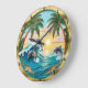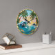 This circular wall clock features a vibrant, sculpted scene of dolphins leaping through ocean waves under a dramatic sunset sky. Two palm trees frame the top, while golden leaf-like embellishments adorn the bottom of the waves. The entire artwork is encased in a golden, ridged frame, giving it a three-dimensional, tropical aesthetic.