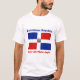 An editable title and slogan accompanies the white cross within blue and red quadrants of the Dominican Republic flag on the front of this t-shirt. The back displays a detailed map of Dominican Republic.