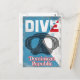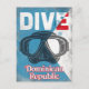 Dominican Republic Caribbean vintage scuba mask travel poster design. A blue and white diver down flag background with a retro scuba mask and word "Dive" at the top.