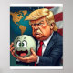 Cartoon illustration of Donald Trump holding a ball with an angry face with the American world behind him.
