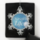 Celebrate the holidays and celebrate the Gift of Life with this gorgeous Donate Life ornament with snowflakes and ornaments set against a blue background. (We also have it with an elegant red background. Our ornament will bring an extra touch of meaning and beauty to your holiday season. Merry Christmas from Kristin 'n' Steve at KNS Gear, and thanks for shopping our Christmas Store!