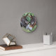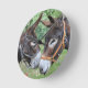 A photo of two friendly brown grey donkeys touching noses with a background of grass and trees. They look very cute with their ears forward and white rings around their gentle eyes. The photograph was taken at a show in France where donkeys are very popular. This clock has a face with white numbers and dots.