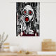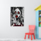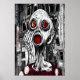 A black, white and red art pf a sick and scary person with red eyes and mouth with a building in the background. This is a AI generated art.