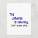 This funny slogan reminds you that even though that fart you just slipped out was supposed to be of the silent but deadly variety there is something that always knows when you pass gas, no matter how discreet you are. The text of the graphic says: ' The Universe is Listening. Don't break wind.' The colours of the words are blue and orange.