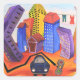 A colourful, fun, imaginative painting depicting someone in a car leaving a town with bent buildings.