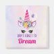 A plastic magnet with an inspirational quote which says: Don't Forget to Dream. Designed with a trendy pink unicorn. Adorned with a fancy floral headpiece. Whimsical butterflies flying around. A pale purple, pink and yellow watercolor background.