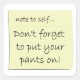A yellow sticky memo note with the reminder "Note to self, don't forget to put your pants on!" in hand written script.