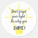 Don't forget your light. It's why you SHINE! Spread your positivity and inspirational wisdom with this awesome button. Purchase this uplifting, cheerful, and positive button to lift others' spirits while you wear it. Gift it to a friend, colleague, or family member to bring a smile to their face.