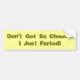 Don't Get So Close....I Just Farted! Bumper Sticker