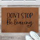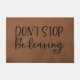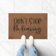 Funny quote, "Don't Stop Be leaving" typography on a light brown faux leather background.