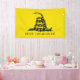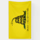This design features the Gadsden Flag, a historical American flag that contains an illustration of a timber rattlesnake raising itself from the grass in an aggressive posture; there is a bright yellow background that covers the flag. The text says "Don't tread on me" in capital lettering.