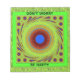 The image prominently features the uplifting phrases "DON'T WORRY" at the top and "BE HAPPY" at the bottom. At the centre lies a vibrant, circular kaleidoscopic pattern, framed by a bold green square adorned with small blue circles at each corner. The entire design is set against a bright green, textured background, creating a balanced and centred composition that draws the eye.