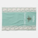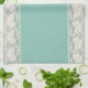 A beautiful teal blue background with lace on the edges and the words; "Don't worry, "BEE" happy"