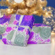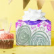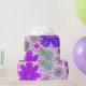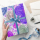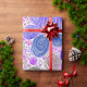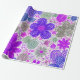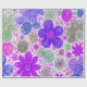 Vibrant flowers in shades of purple, pink, blue, and green are arranged in a whimsical swirling pattern