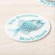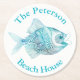 Beach cottage theme pulp board paper coasters, with graphics of a aqua blue doodle style fish, on a white background. Personalise the aqua blue arched text to suit your needs. Great for anytime use and makes a nice gift idea.