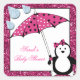 Super cute penguin with pink polka dots bow tie and with a polka dots and stars umbrella with glittery rain coming down but when the bright glittery yellow sun comes out, the umbrella is gone. Poof! Perfect for a girl baby shower.