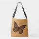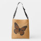 This design features a lovely orange and black monarch butterfly with varied geometric shapes decorating the patterns in the wings and the butterfly's body. This bag is available in multiple sizes and both tote bag and cross body bag styles.