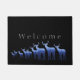 This doormat has an unusual heard of blue tones deer/elk walking across it. Unusual because the bodies of the deer/elk has a landscape scene all over them. Text of Welcome written in silver-grey colour above to greet you and your guest coming up to your door. Shown over black background. Customise this item or buy as designed.