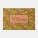 Pretty foliage doormat in with lime brown and peach. This features a delicate trailing leaf design. The background is brown lime and peach and the leaves and trellis are brown. In the centre is a rectangle with Welcome in a curvy French font. But you can change this to say what you like.