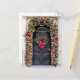 Celebrate the season with the timeless elegance of English architecture. This greeting card features a beautifully captured black door in London, England, framed by a lavish archway of evergreen garland, red floral accents, and shimmering gold baubles. A matching wreath and bright red bow complete the festive look, inviting the viewer into a warm, holiday atmosphere.
