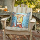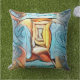 An outdoor pillow decorated with an abstract representation of the doorway to beyond. Watery swirls in blue and organic growths form a dreamscape of success.