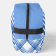 Blue lines in varying five shades Dark to light, bottom to top. Two Sets of stripes are placed diagonally, meeting at the centre of top and bottom of bag on each side. These two sets are then replicated and flipped, so that they cross. Top panel is lightest shade of blue.