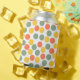 This can cooler has a geometric design of dots in coral, gold, and sage green.