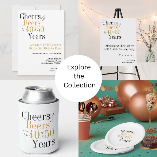 This is a cool and modern, Double Birthday party design with a cheers and beers theme. It is a simple, minimal design, in classic black and white, with pops of orange and gold coloured typography. Perfect for a cool and fun, double celebration birthday party or celebration. This design is fully customisable, simply use the personalise this button to change the age, or the rest of the text, or use the editing tool to change the colour or font. If you need help with personalisation, matching products, or for a custom design, contact me via zazzle chat or email: ursuladawnmoon@gmail.com