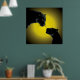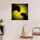 This image depicts two black panthers facing each other against a vibrant yellow background. The panthers are rendered in a silhouette style, emphasizing their sleek, muscular forms and the intensity of their gaze. Their eyes, glowing a bright yellow, are the only points of color in the image, adding to the overall dramatic effect. The yellow background creates a stark contrast with the black silhouettes, further highlighting the panthers' presence. The overall atmosphere of the image is one of mystery, power, and perhaps a hint of tension or intrigue.