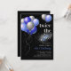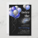 Blue & silver joint birthday invitations featuring a stylish black background, glittery party balloons, and a "twice the fun" text template that is easy to personalise.