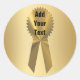 Easily add your custom name or any text onto the gold ribbon graphic. Elegant, cool and classy plain gold metallic look matching background. Shown is the popular round shape sticker. Other shapes and sizes are available. Nice for labels, awards, prizes, party favours, team wins, congratulations, success, motivation, etc. Expensive looking without the expense! Make great and unique party favours and envelope seals!