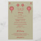 An original illustration of elegant and chic red double happiness lanterns in modern kanji / chinese writing hanging on strings of fairy lights, on a simple greenish moss grey/grey colour background wedding program.