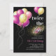 Pink & gold joint birthday invitations featuring a stylish black background, glittery party balloons, and a "twice the fun" text template that is easy to personalise.