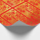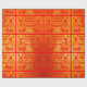 Red Chinese paper-cut with two rabbits and traditional Chinese house + lanterns and wishes for Happy New Year + golden textured paper (image printed) as background. Design on wrapping paper.