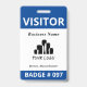 Double-sided vertical visitor badge with a simple design in blue and white. VISITOR is written in bold white letters against a blue background to be easily visible. Add your business name, logo, and branch. At the bottom, the badge number.