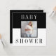 Modern minimalist colorblock design featuring a photo template where you can add your beautiful photo , with black on top and and white bottom colorway with modern simple text saying baby in white on a black background at the top also shower in simple font in black at the bottom.