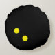 Double yellow dot squash ball throw pillow. Custom round cushion with funny sports design. Personalise with text optional. Fun sports theme design for squash lover, fan, player, sports coach, trainer, friend, colleague, coworker, boss, kids etc. Also fun for teams, clubs, groups, competitions, leagues etc. Eat sleep play repeat! Squash game obsession presents for him or her. Double sided print. Giant squash ball pillow.