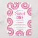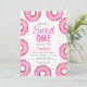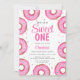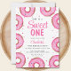 This cute Doughnut Girl's First Birthday Party Invitation is decorated with pink watercolor doughnuts and stylish typography.