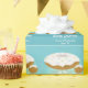 Wrapping paper for a baby shower showing a smiling, frosted, doughnut and a baby doughnut hole character. It includes sprinkles and a blue colour scheme. All of the words can be customised.