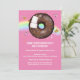A beautiful and magical watercolor rainbow in pastel colours appears behind a realistic illustration of a doughnut with brown icing; white marshmallows and yummy dessert sprinkles. Small pretty pink and orange butterflies are flittering around it and small white sparkling stars appear behind them. The pink background may be changed to any of your choice and the wording personalised to suit your special occasion. This is ideal for little girls magical fantasy birthday parties; for adorable baby shower events and fairytale theme birthdays.