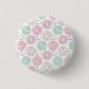 Button with a deliciously fun pattern. Illustration of pastel pink and green doughnuts with sprinkles and icing.