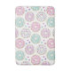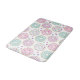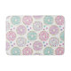 A bath mat with a deliciously fun pattern. Illustration of pastel pink and green doughnuts with sprinkles and icing.
