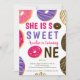 She is so sweet, turning one. Celebrating the 1st birthday .A cute and modern hand drawn and watercolor painted chocolate doughnuts, pink glaze and sprinkles and a cool font typography on a fully customisable background.