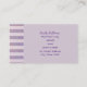 A business card template with a yummy illustration of a pink frosted doughnut with colourful sprinkles. The left border has a vintage style pattern with faded purple stripes. Cute and stylish design for a baker, bakery or other doughnut themed businesses.