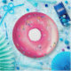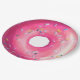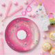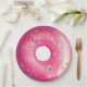 Fun paper plates with a yummy illustration of a big pink frosted glazed doughnut with colourful sprinkles.